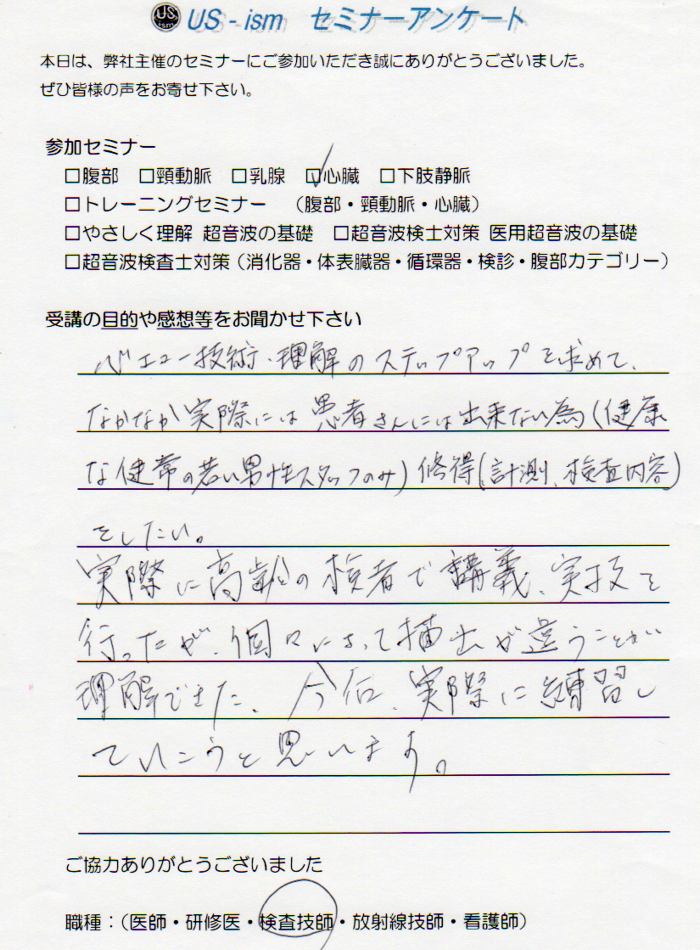 基礎をしっかり聞いた上でプローブを持つことで、プローブの動かし方を考えられるようになり、見ずらい患者さんに対しても上手く描出できるようになれたと思います。また、計測のポイントと、どのような時にどの計測を行えばよいのかが理解できました。今まで腹部ばかりをやってきたので、その調子だと上手くできなかった部分に光が見えた感じです。今日は本当にありがとうございました。
