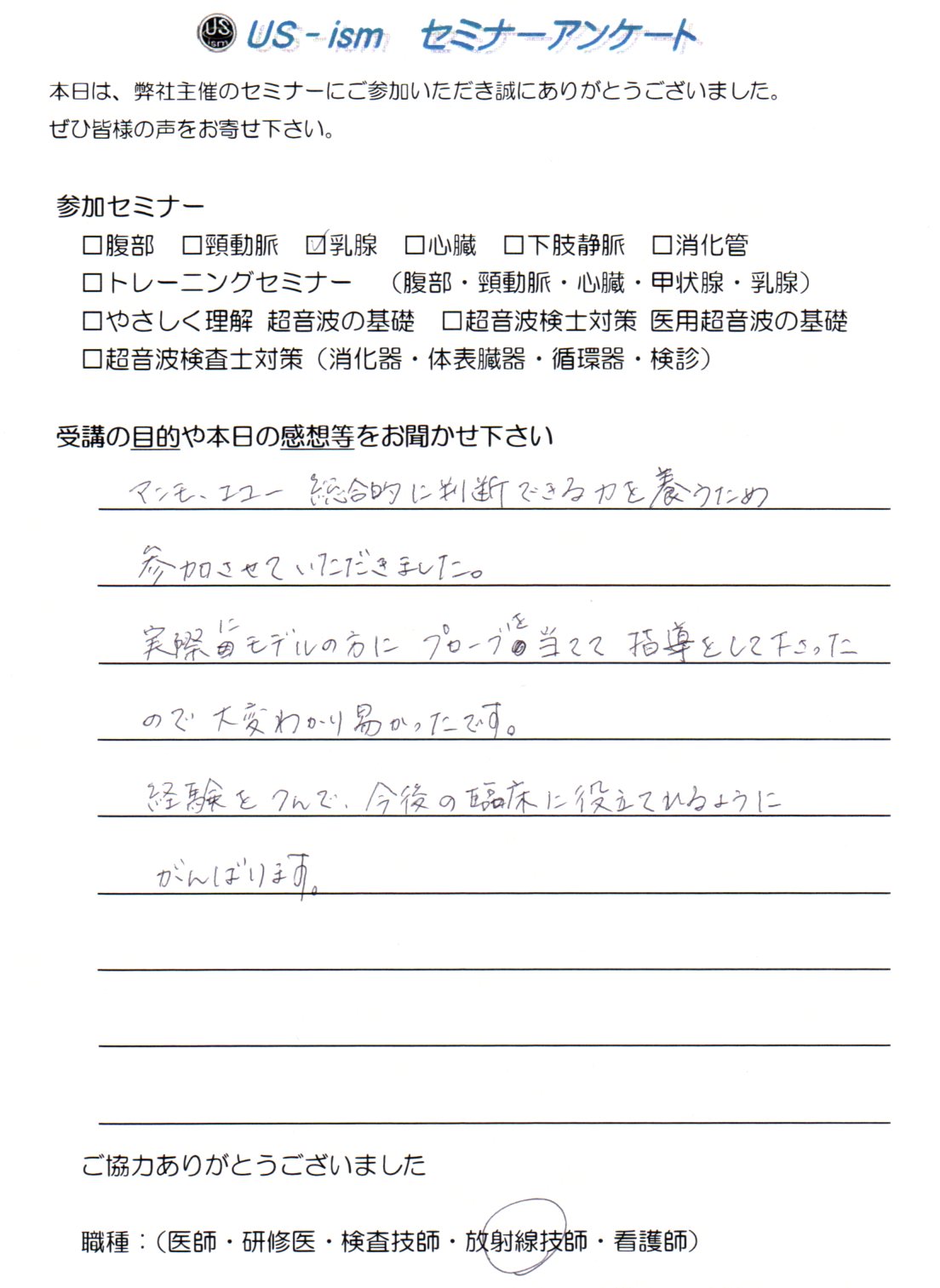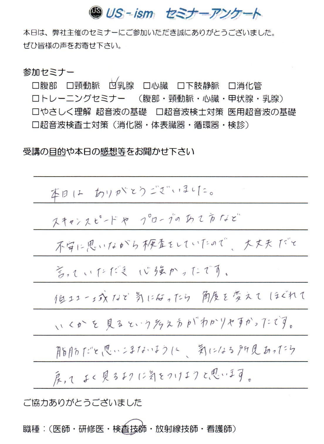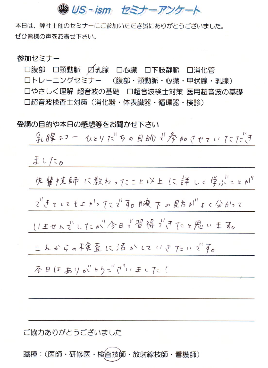 先輩技師に教わったこと以上に詳しく学ぶことができて、とてもよかったです。腋下の見方がよく分っていませんでしたが、今日で習得できたと思います。これからの検査に活かしていきたいです。