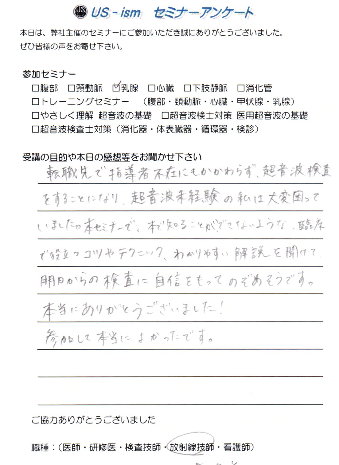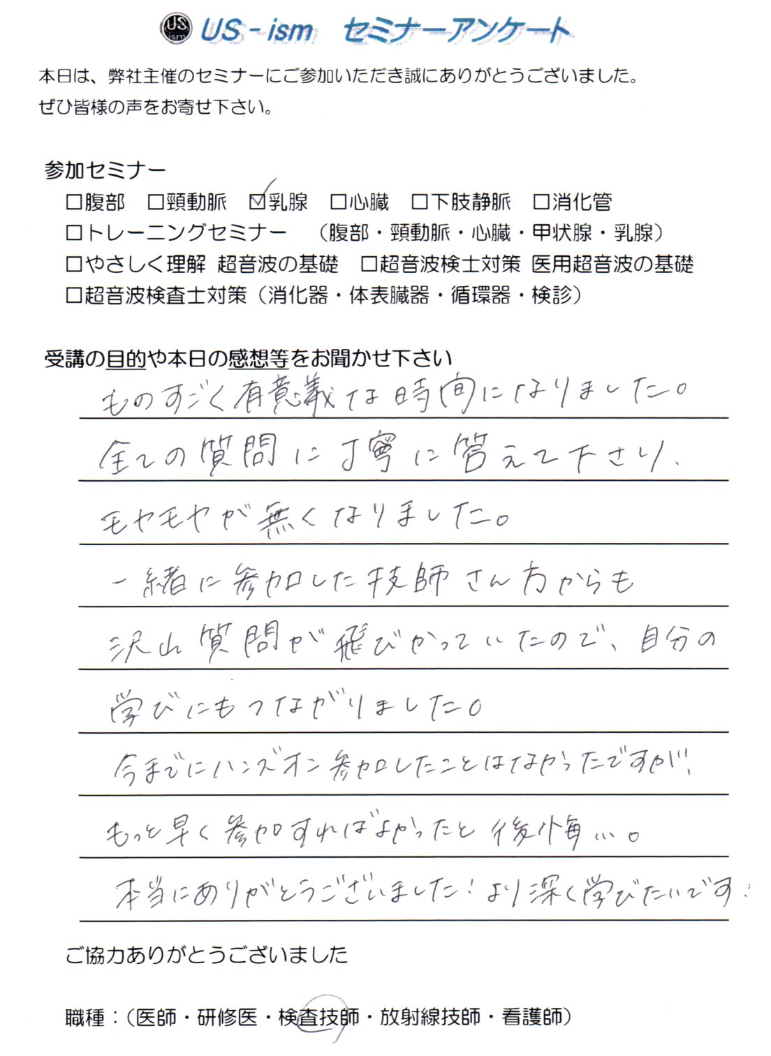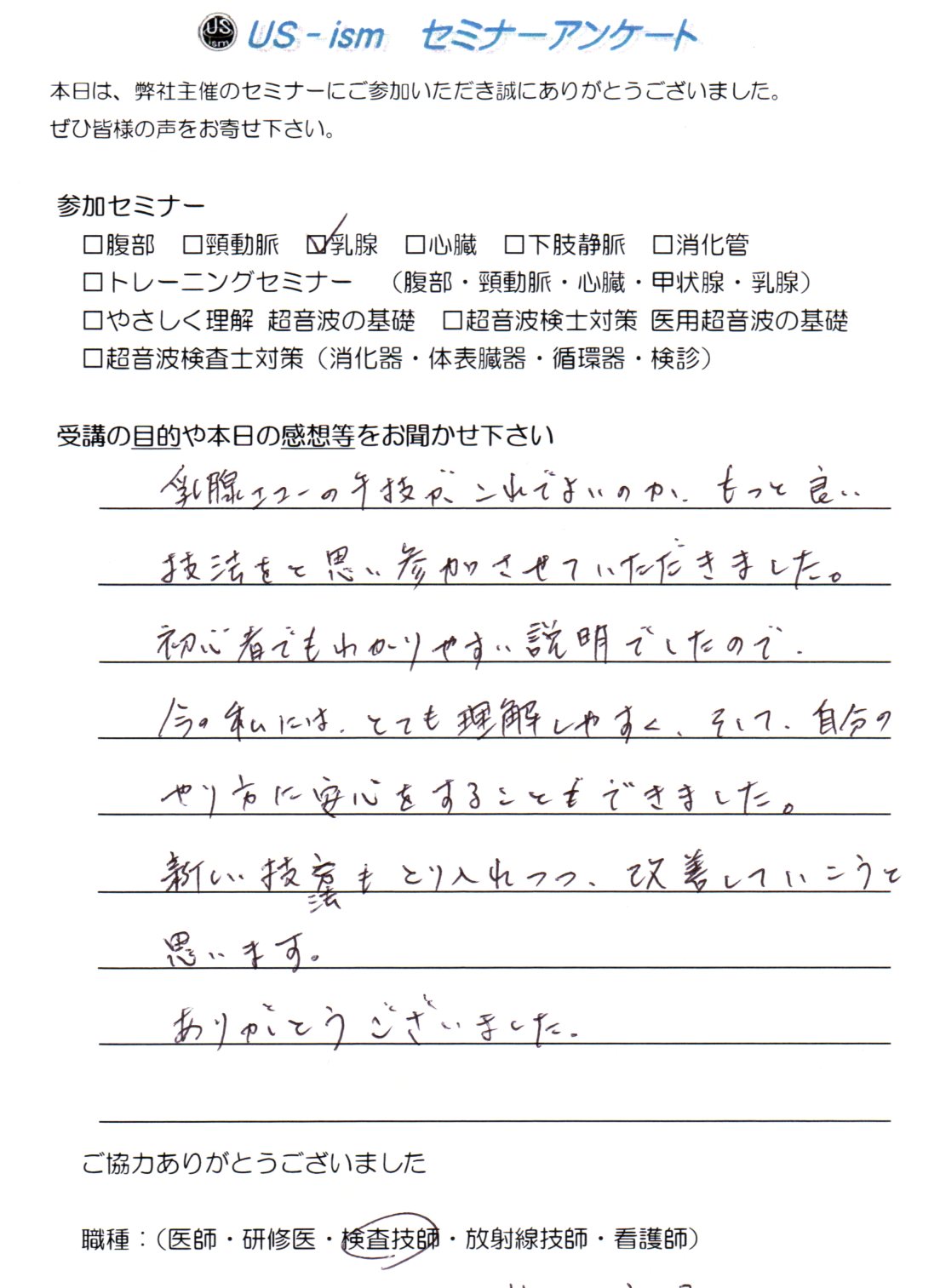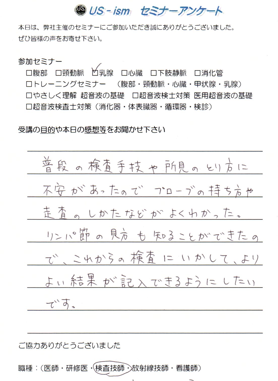 先輩技師に教わったこと以上に詳しく学ぶことができて、とてもよかったです。腋下の見方がよく分っていませんでしたが、今日で習得できたと思います。これからの検査に活かしていきたいです。