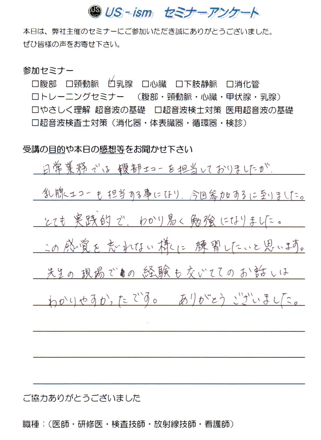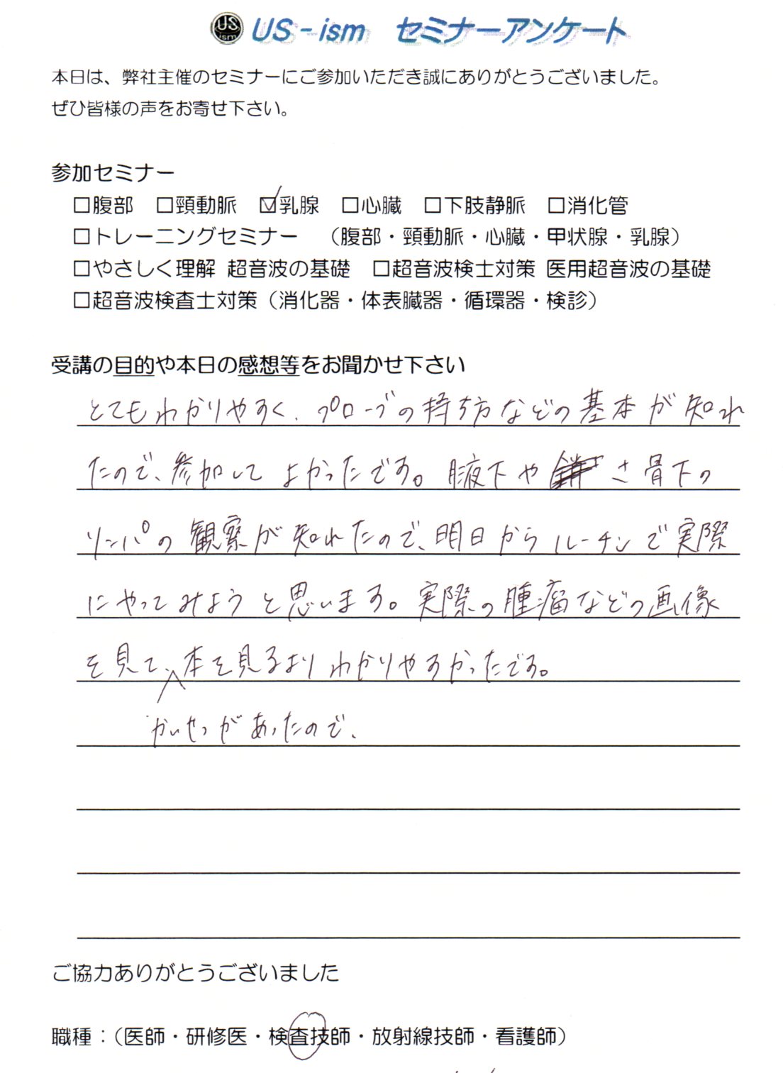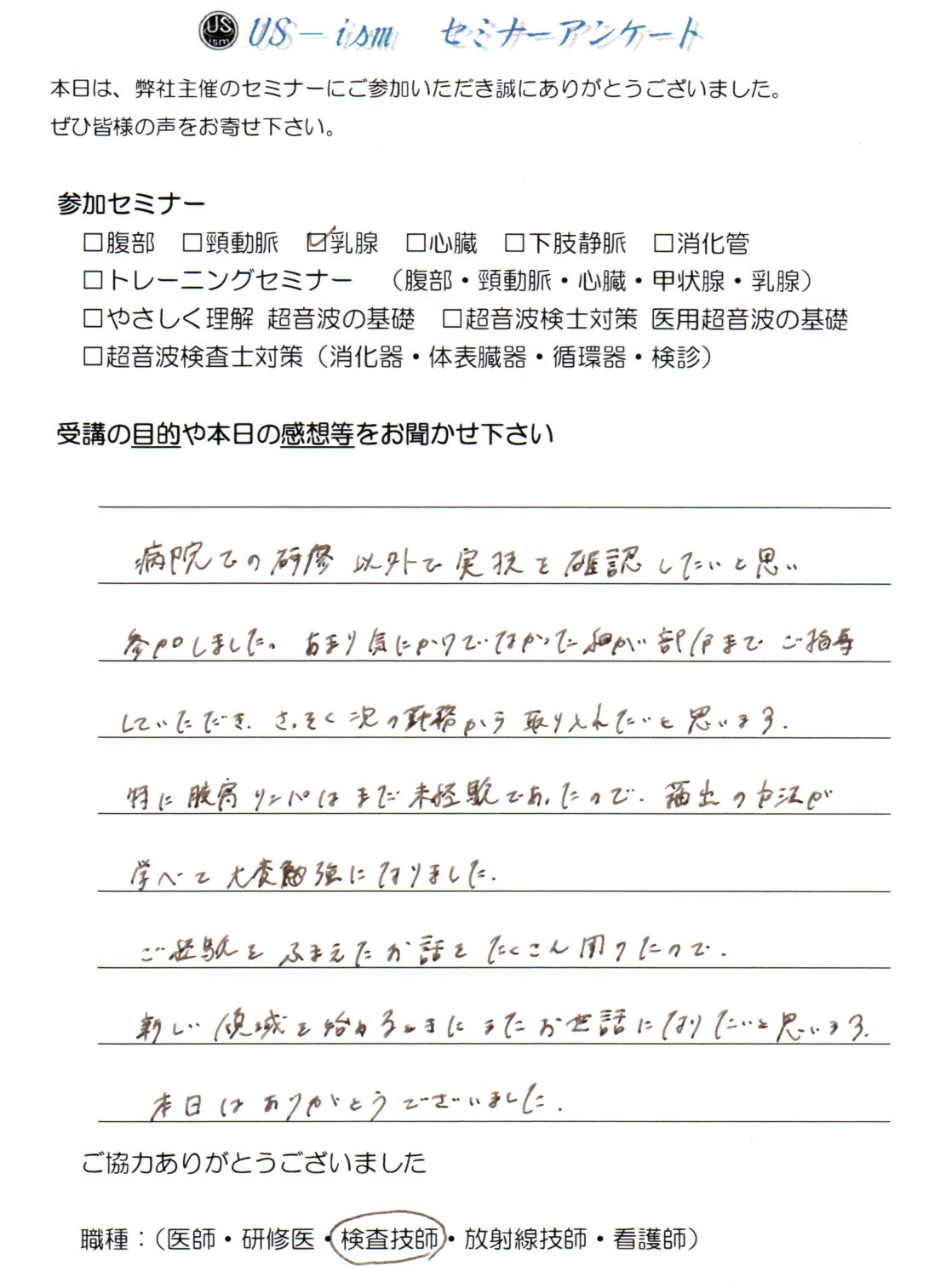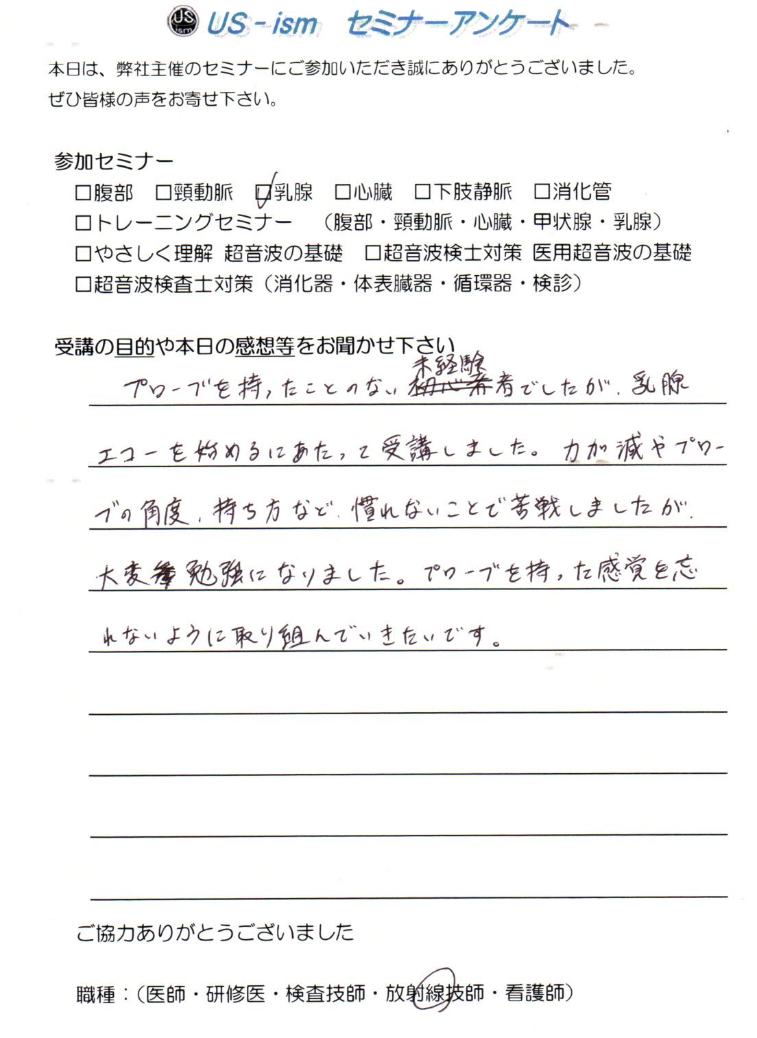 今まであまり意識できていなかった描出のコツや腫瘤のよう悪性判断の仕方等、大変勉強になりました。本日学んだことを念頭に、日々の業務に取り組みたいと思います。