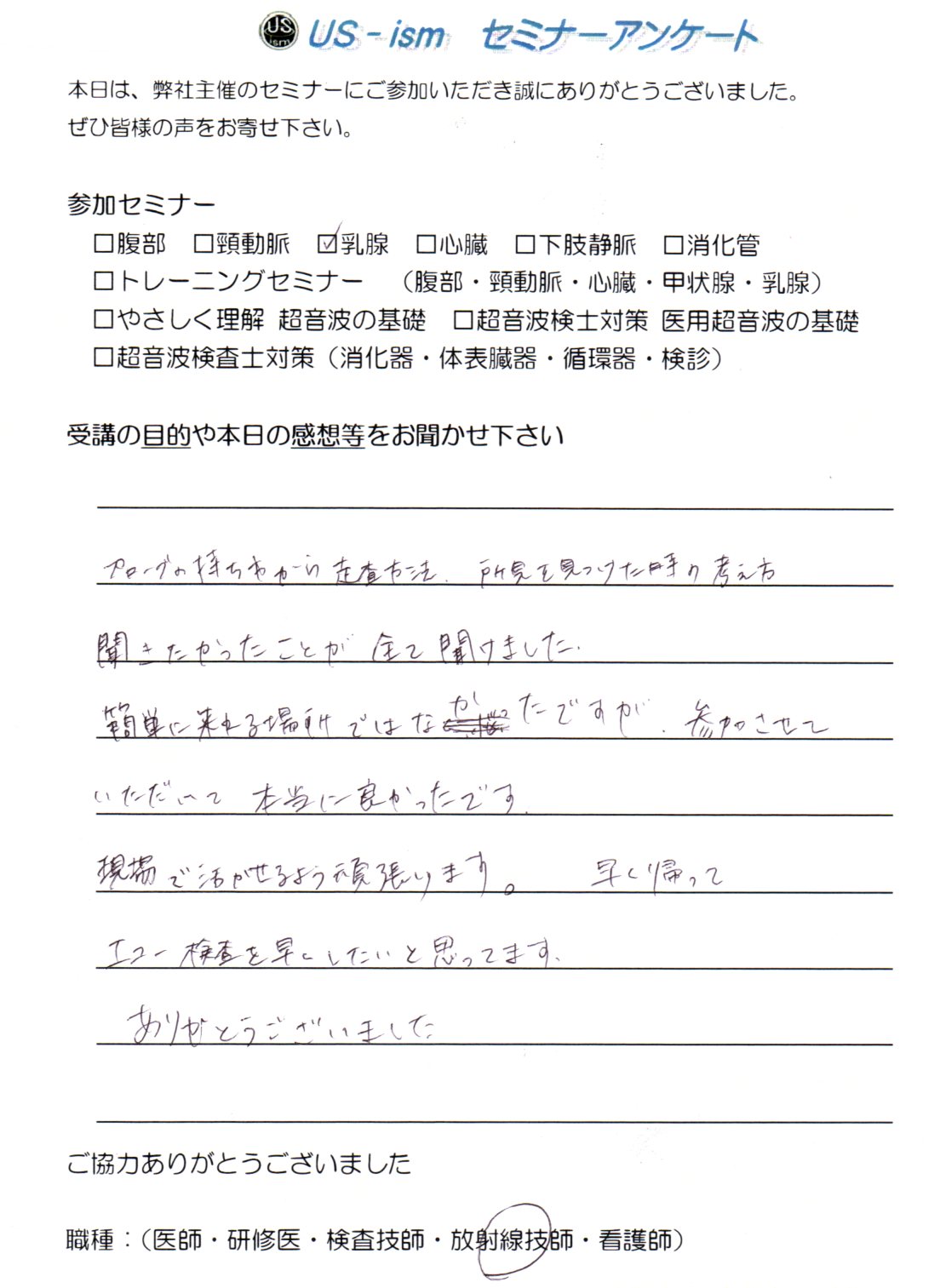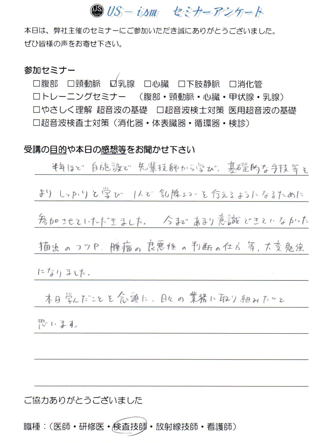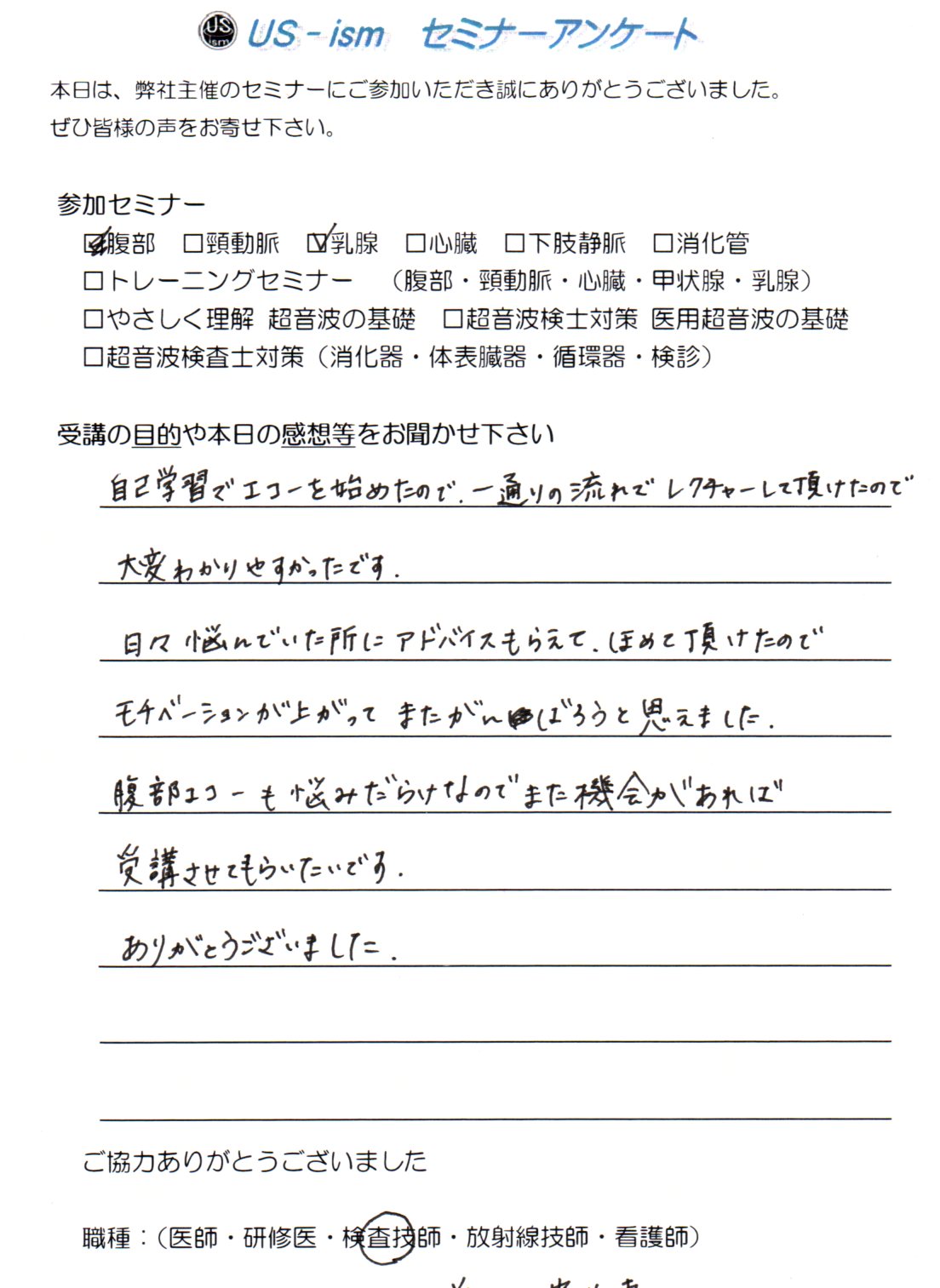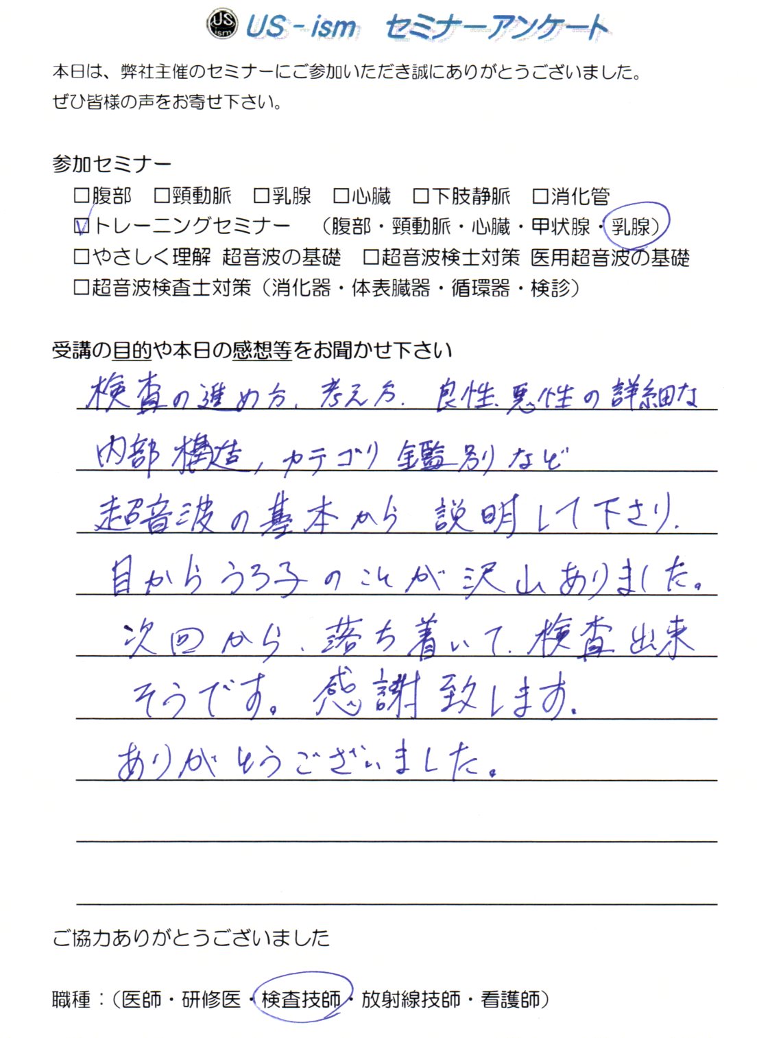 今まであまり意識できていなかった描出のコツや腫瘤のよう悪性判断の仕方等、大変勉強になりました。本日学んだことを念頭に、日々の業務に取り組みたいと思います。