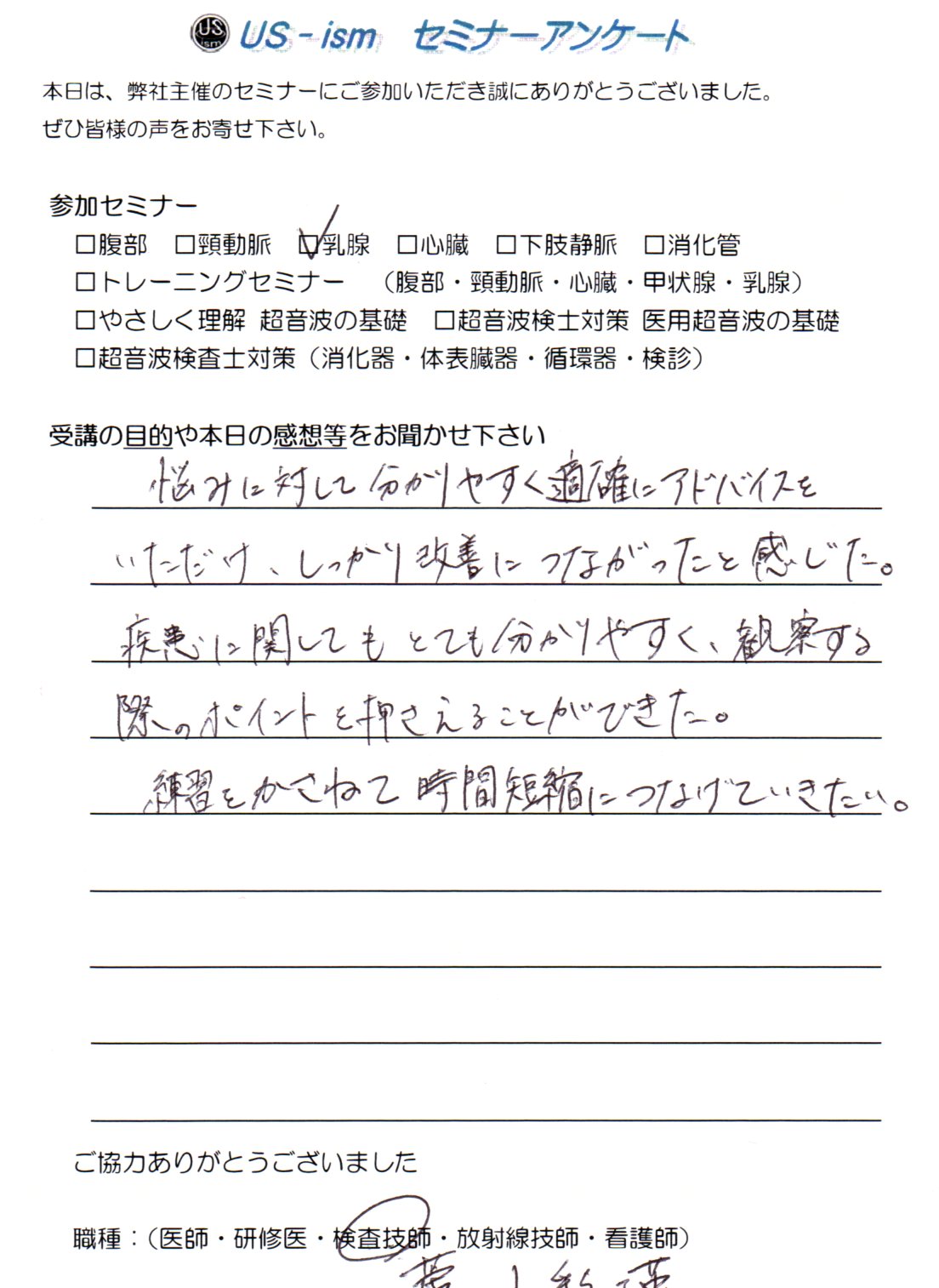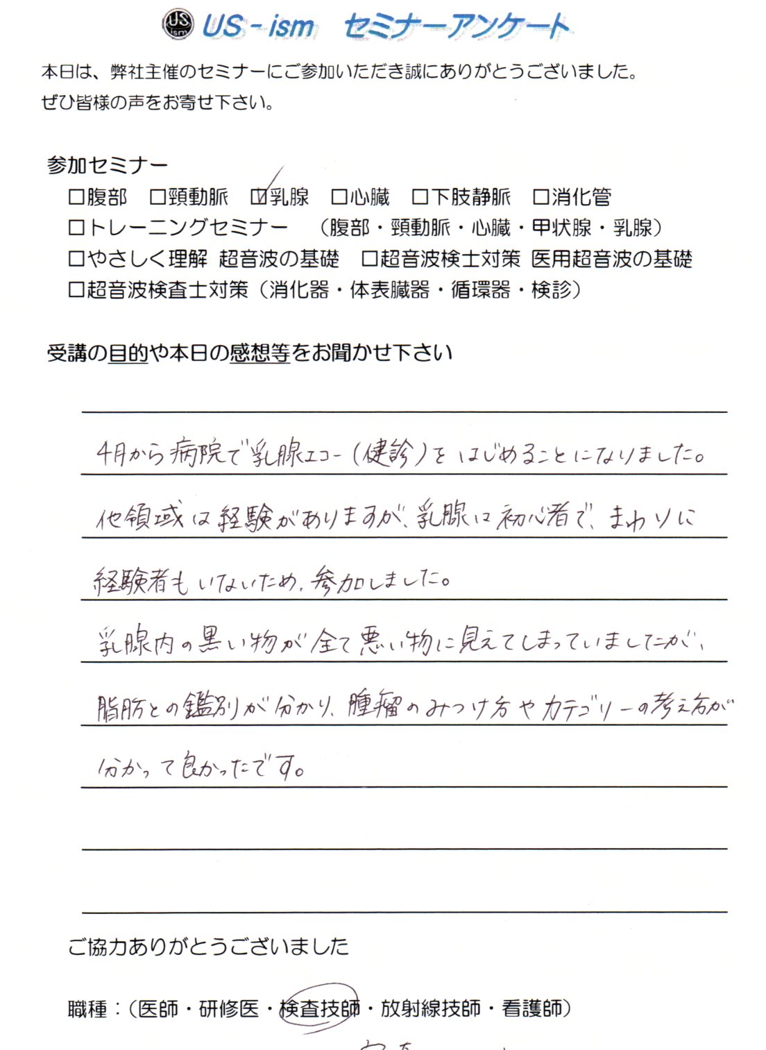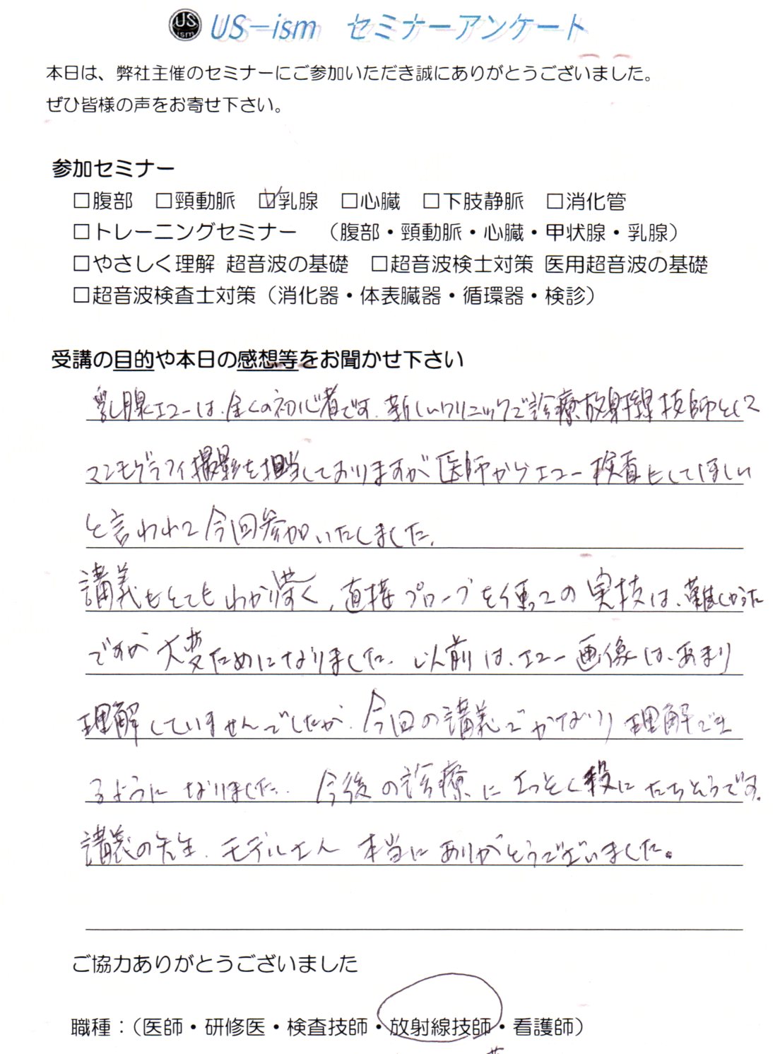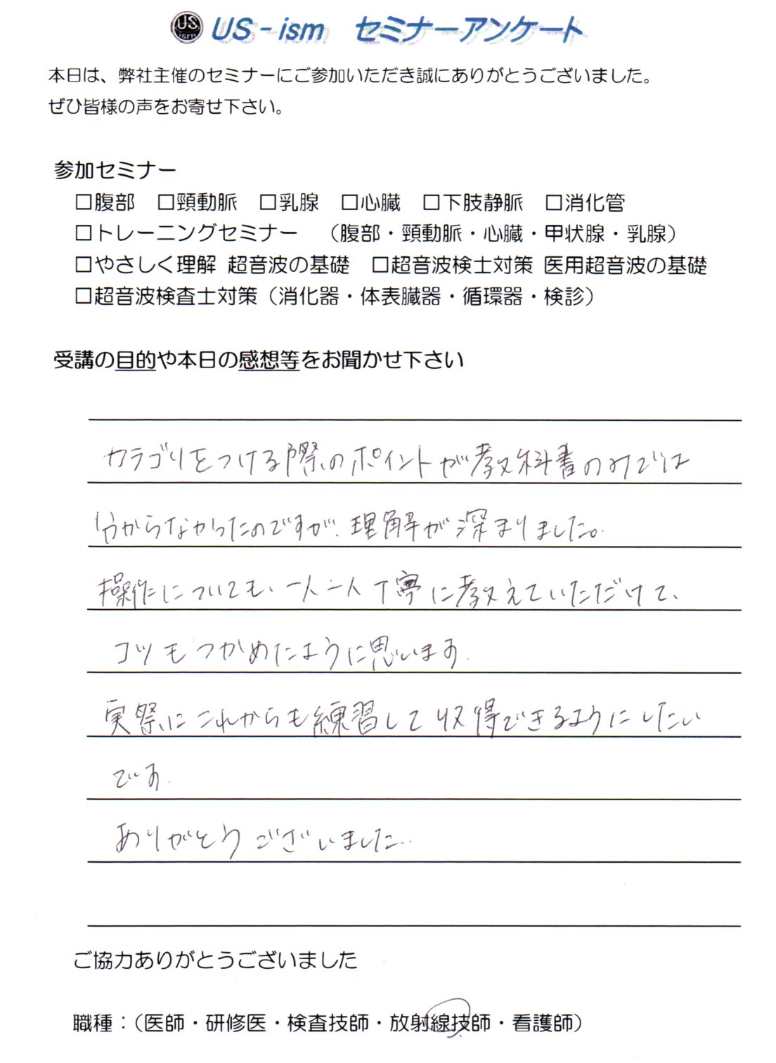 今まであまり意識できていなかった描出のコツや腫瘤のよう悪性判断の仕方等、大変勉強になりました。本日学んだことを念頭に、日々の業務に取り組みたいと思います。