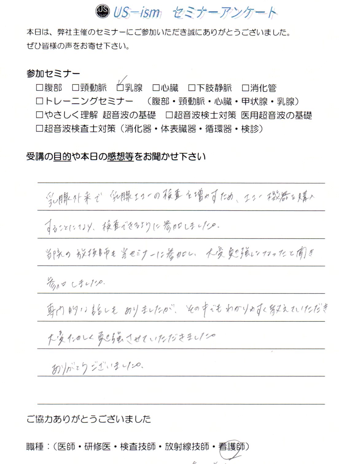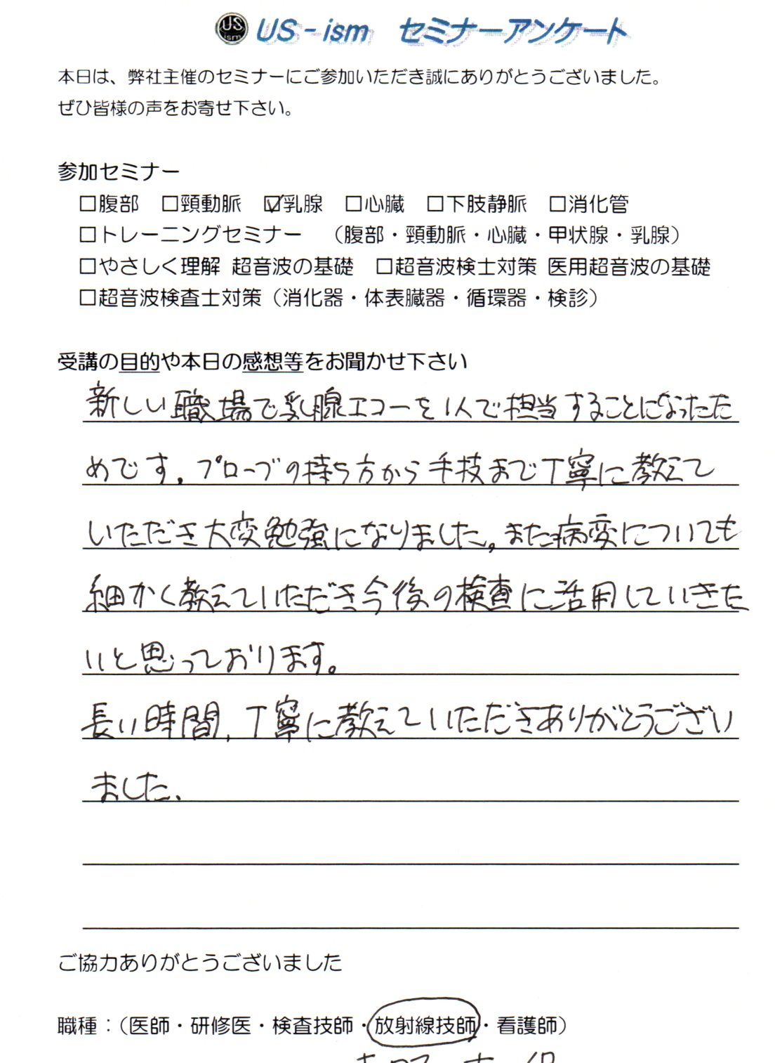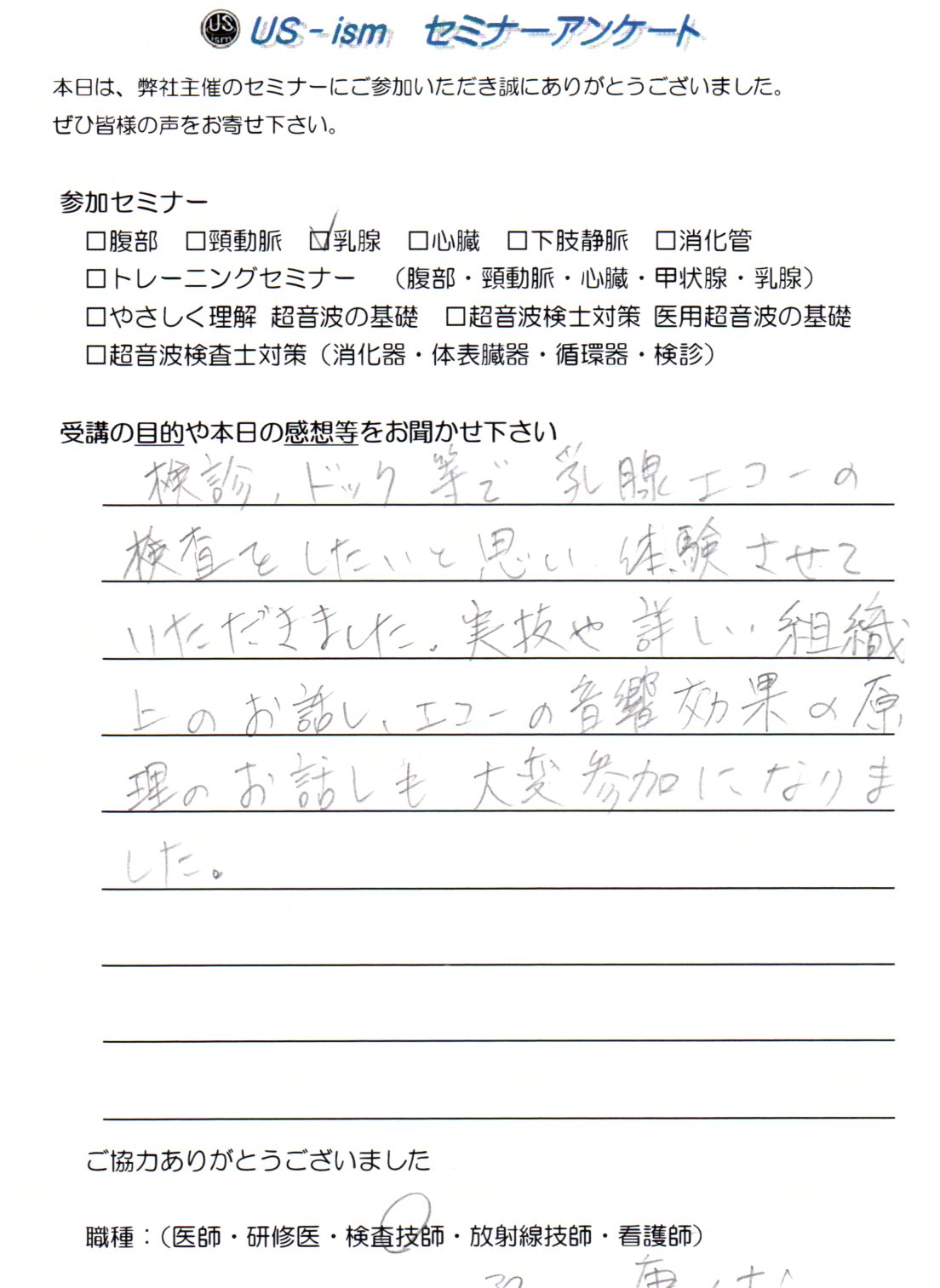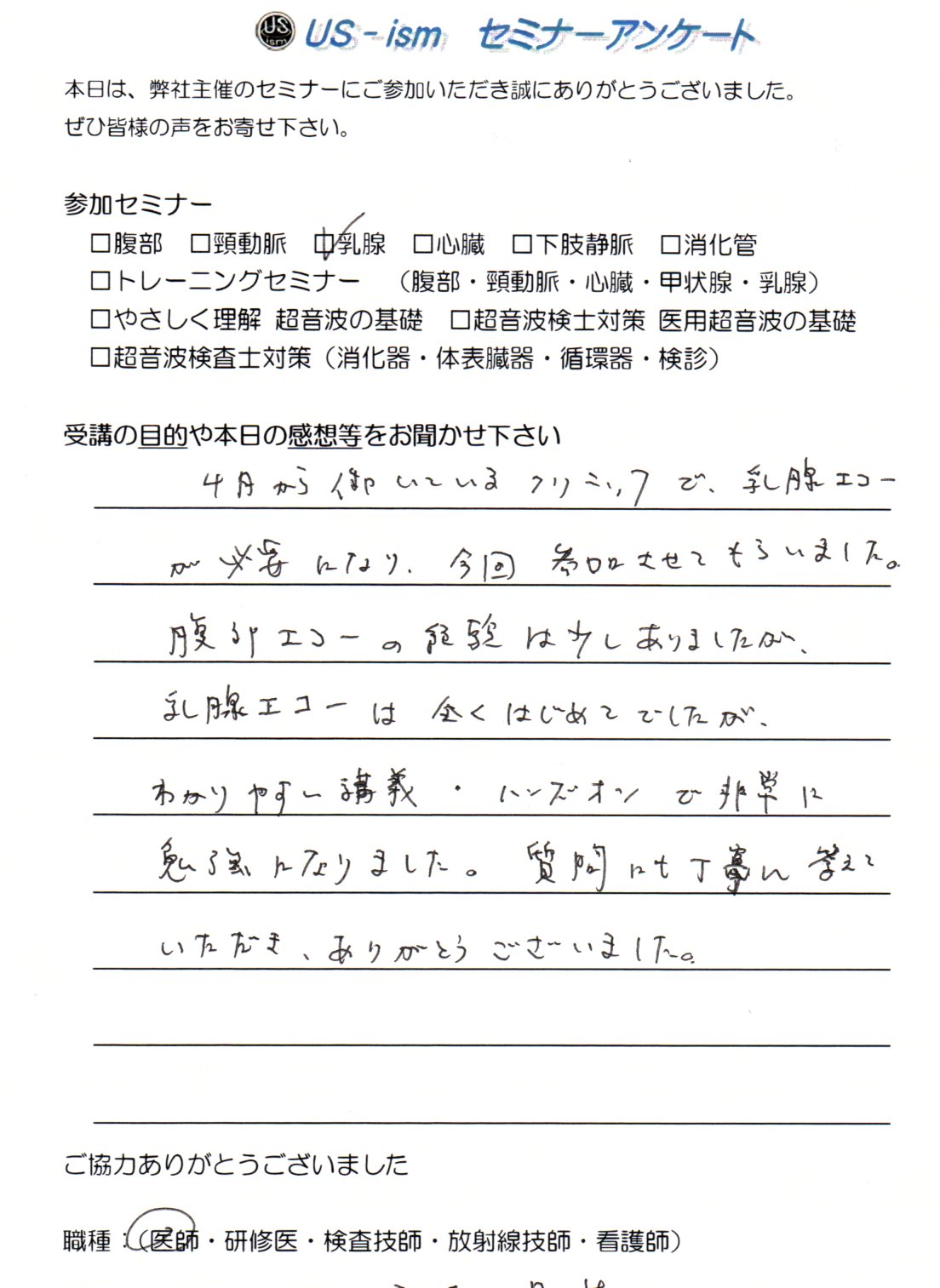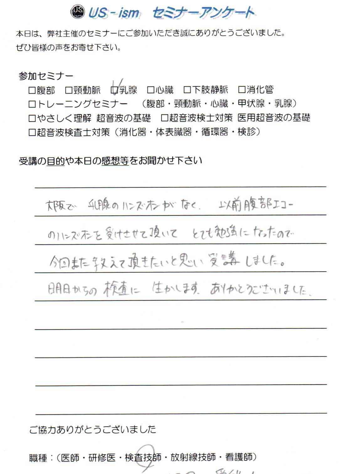 大阪での乳腺ハンズオンがなく、以前腹部エコーのハンズオンを受けさせて頂いてとても勉強になったので、今回また教えて頂きたいと思い受講しました。明日からの検査に生かします。ありがとうございました。