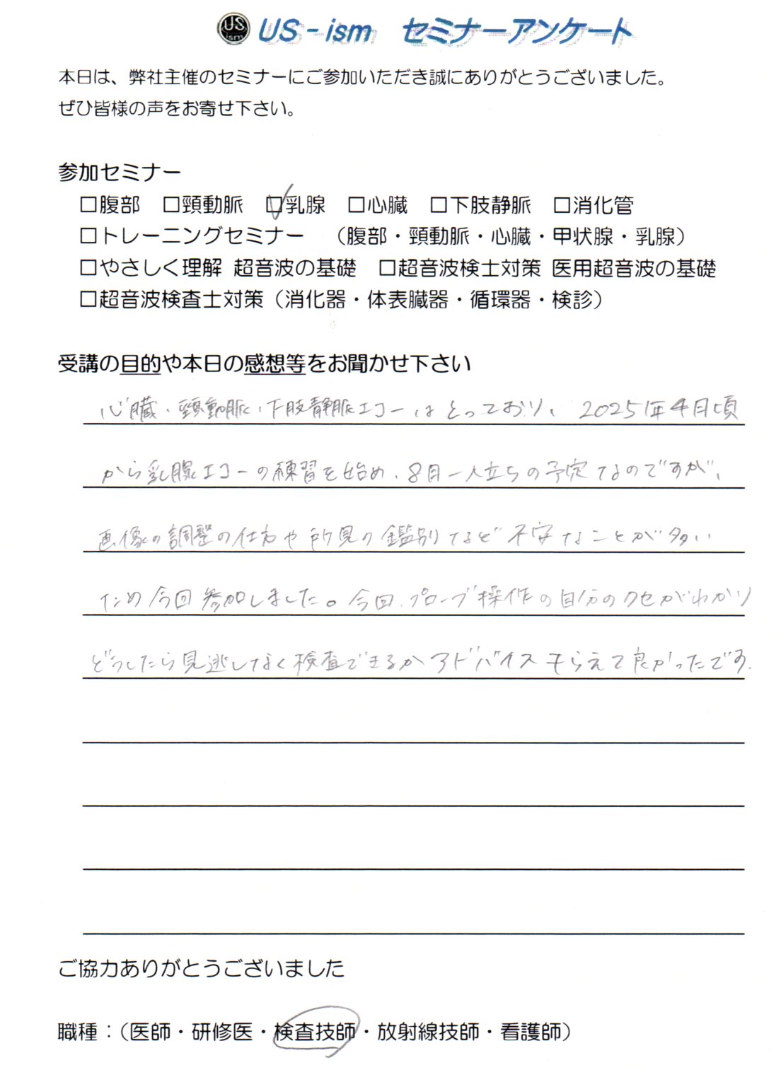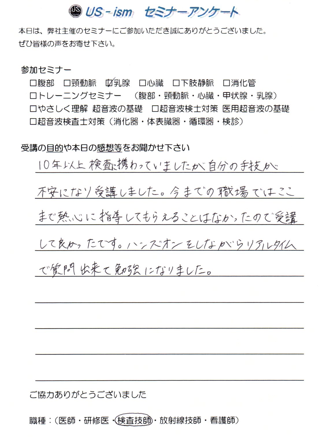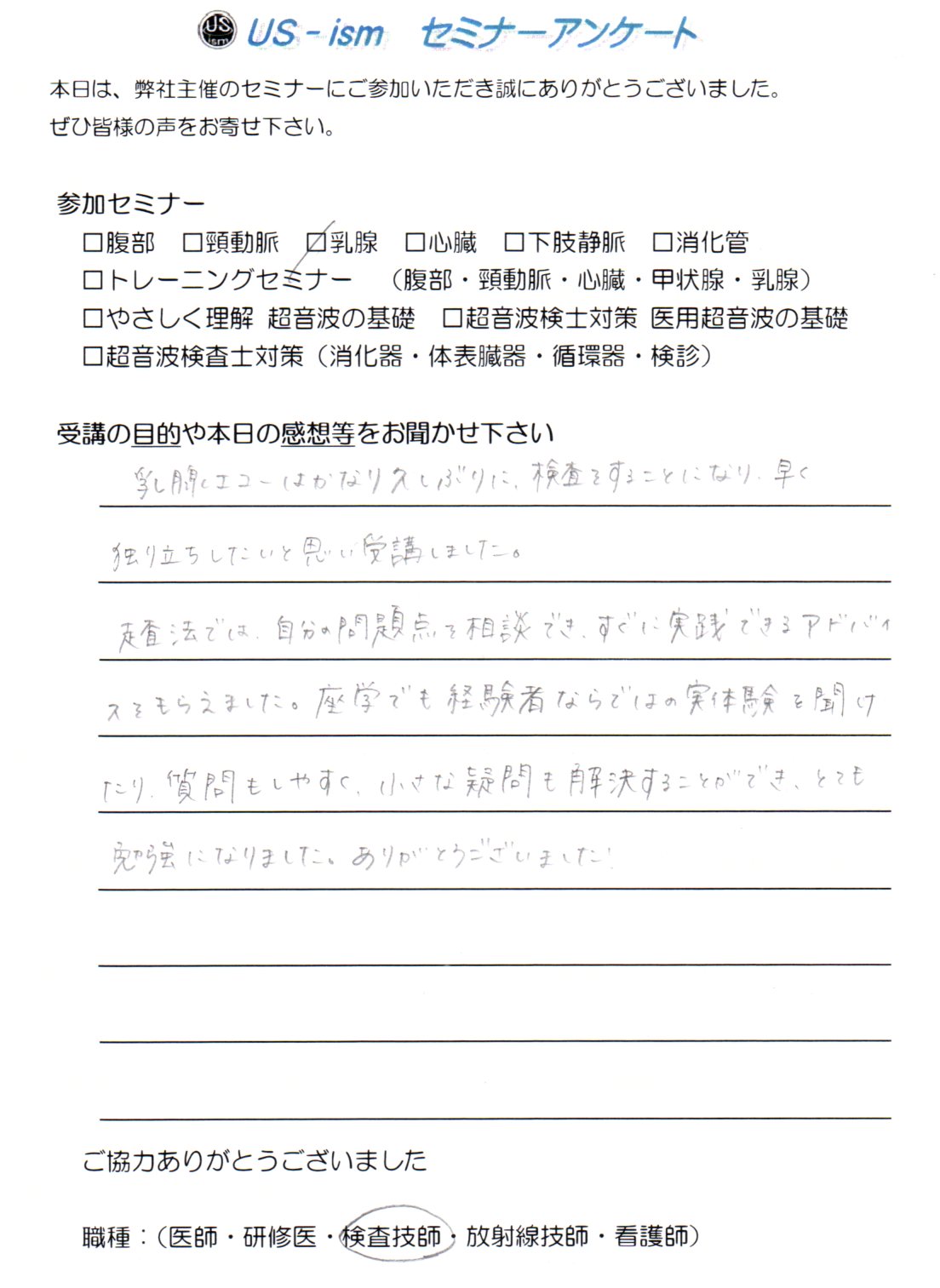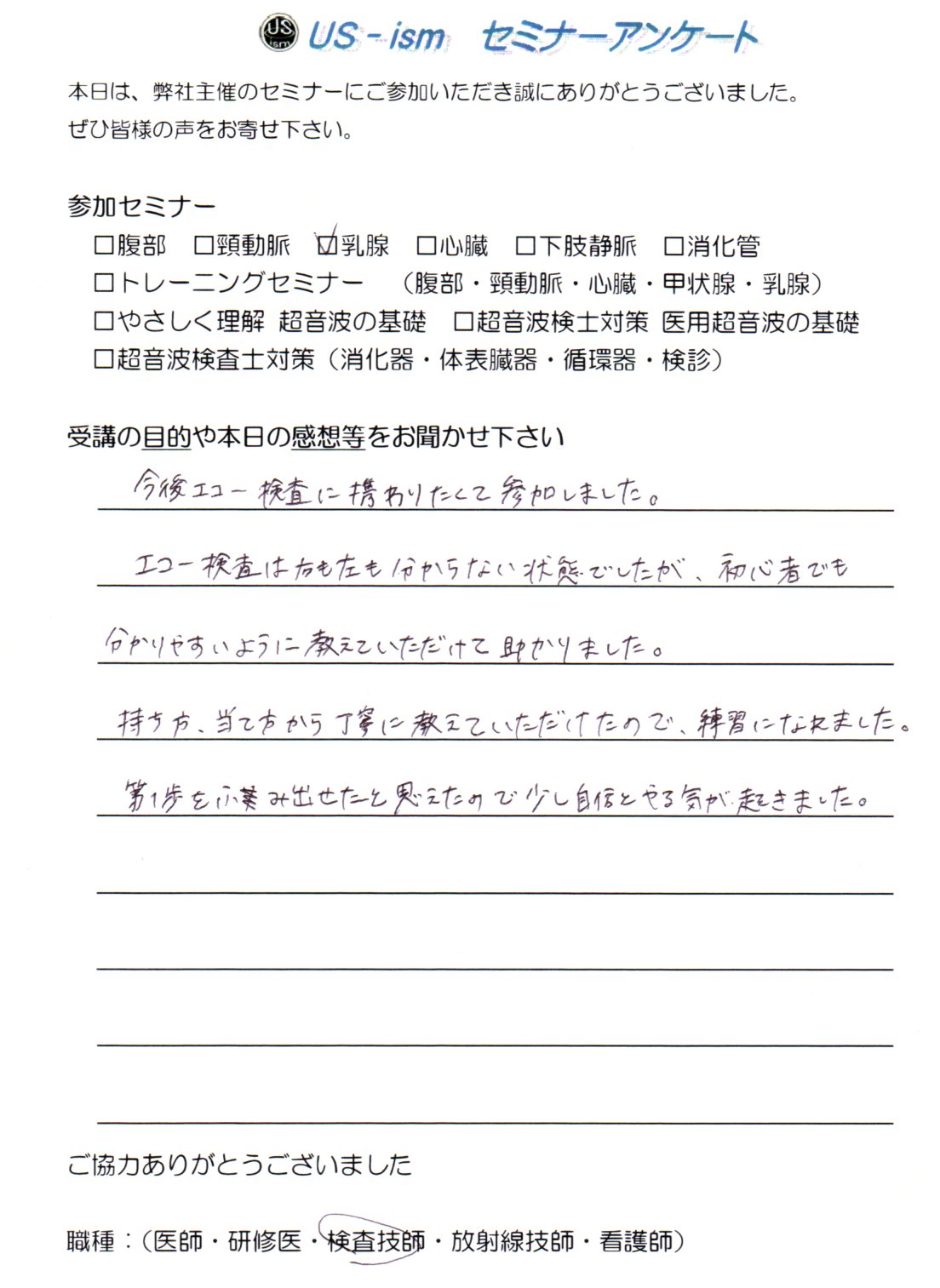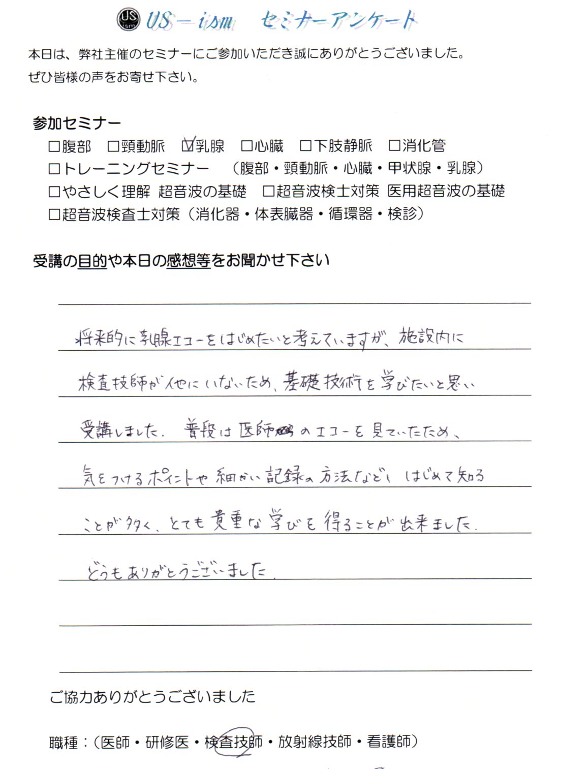 将来的に乳腺エコーをはじめたいと考えていますが、施設内に検査技師が他にいないため、基礎技術を学びたいと思い受講しました。