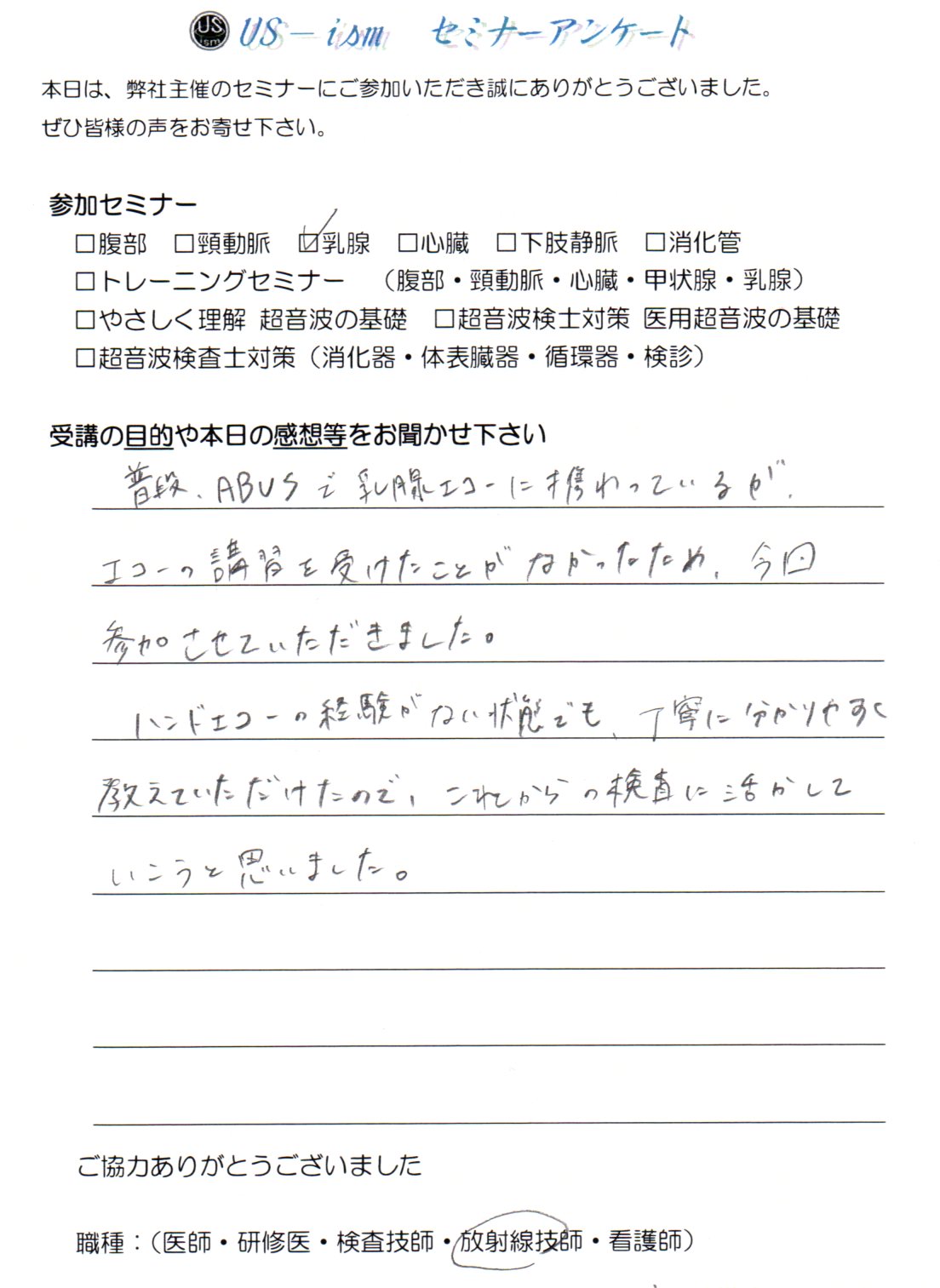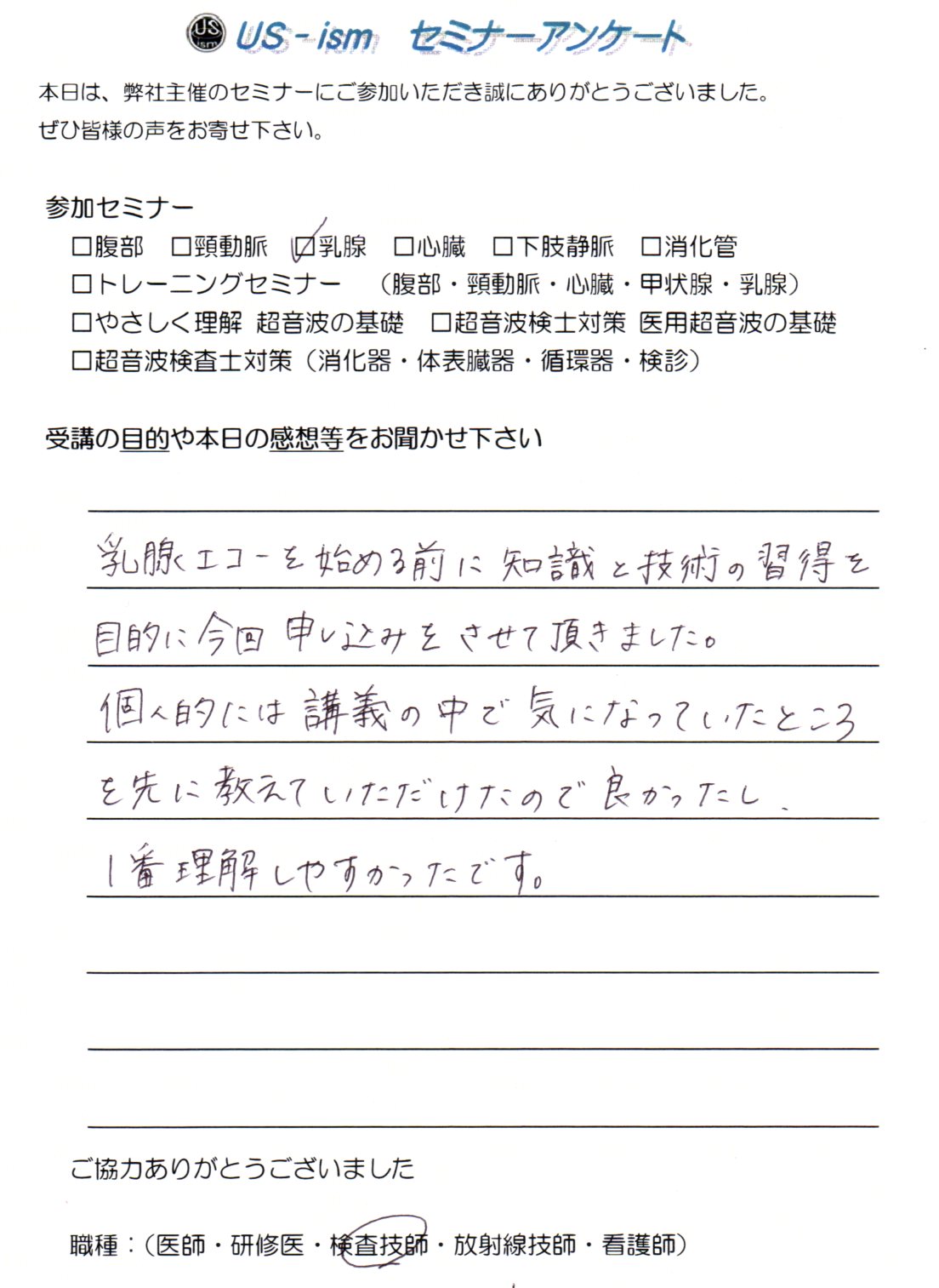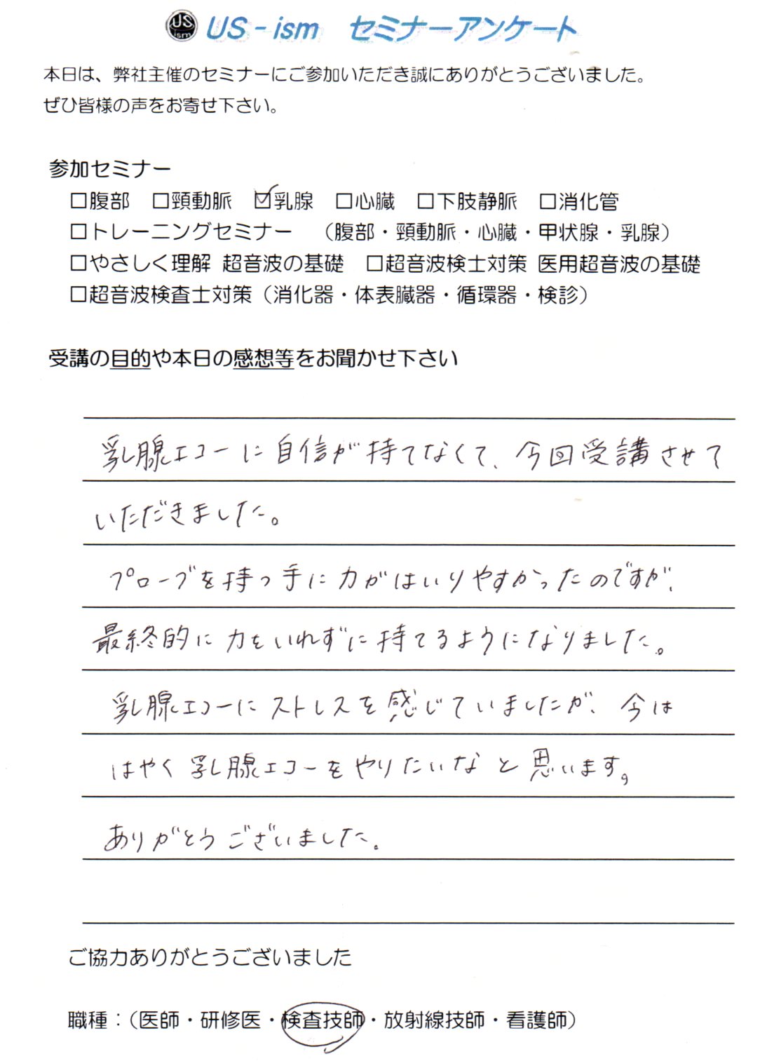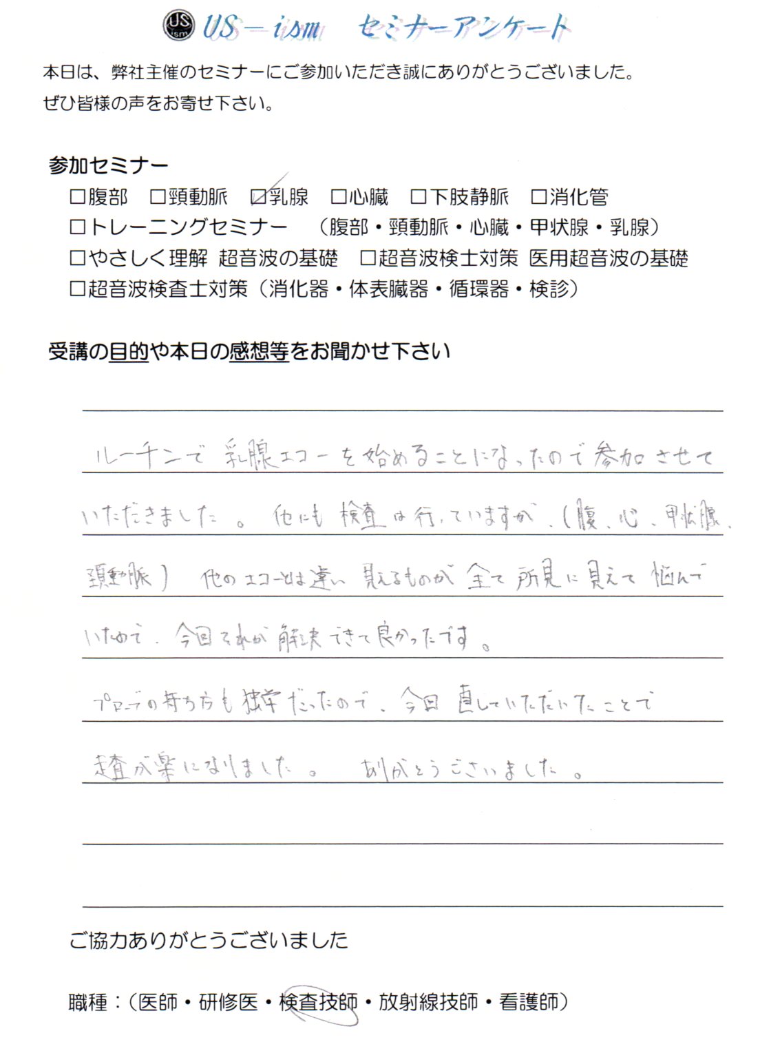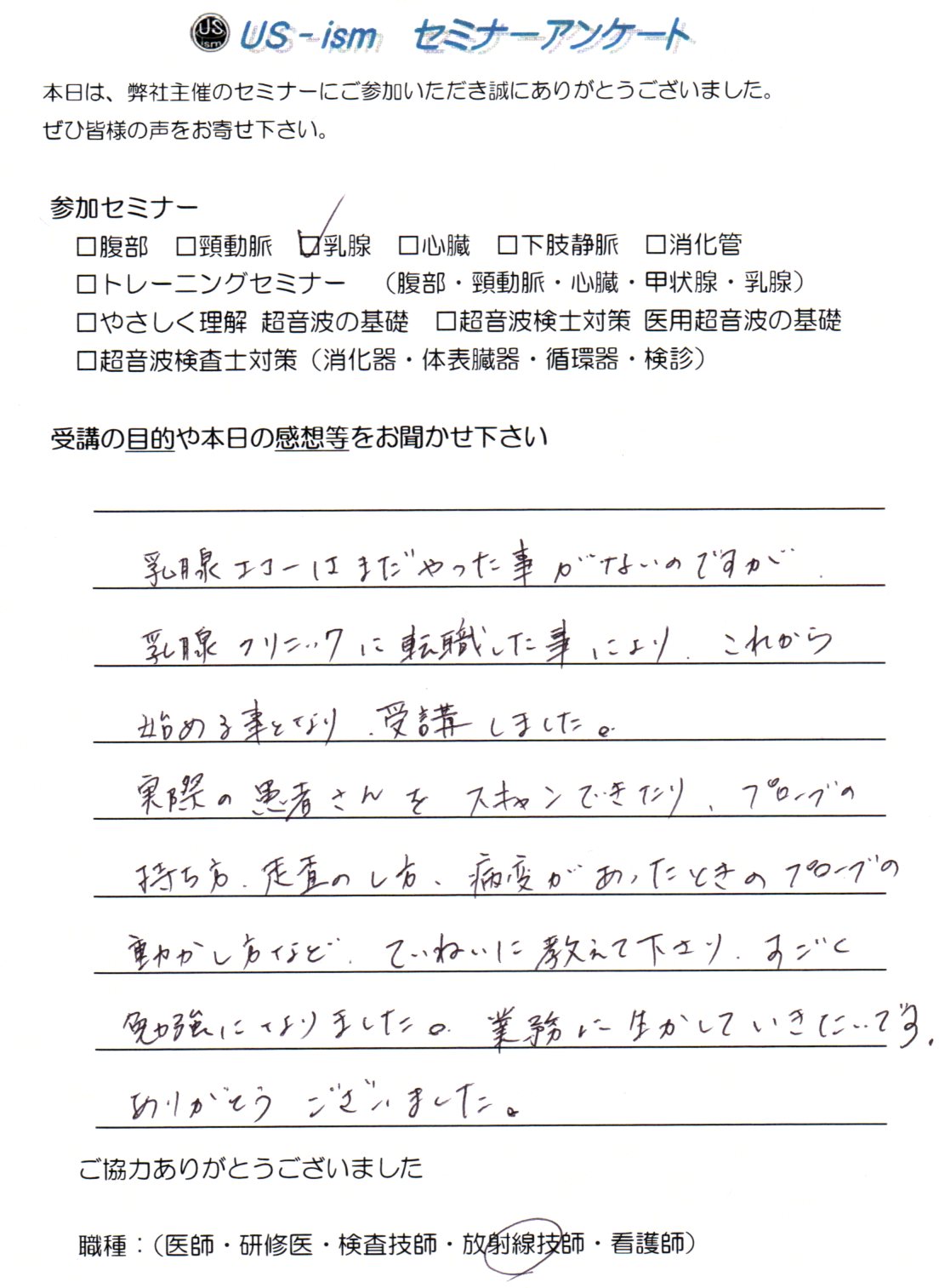 将来的に乳腺エコーをはじめたいと考えていますが、施設内に検査技師が他にいないため、基礎技術を学びたいと思い受講しました。