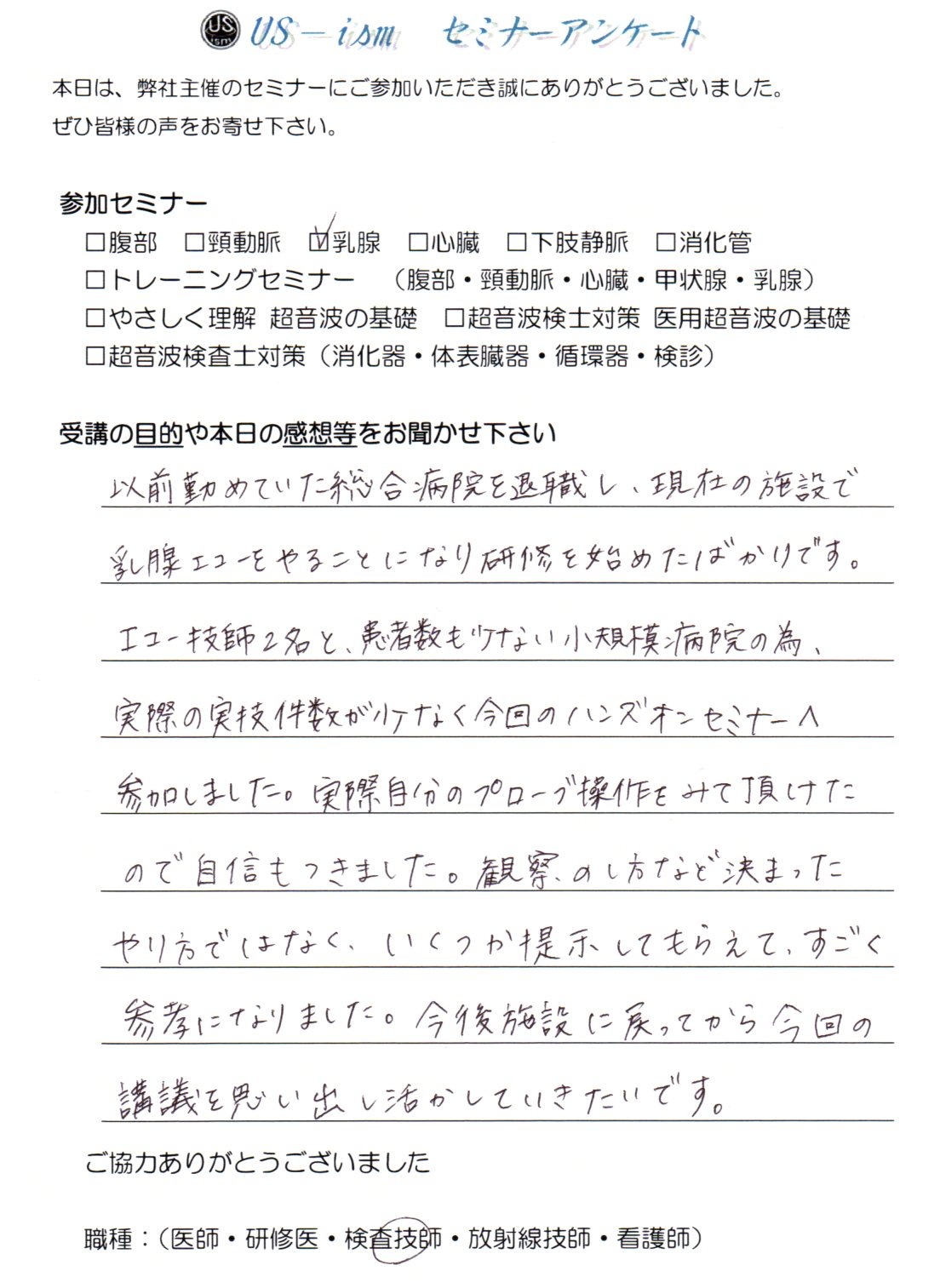 以前勤めていた総合病院を退職し、現在の施設で乳腺エコーをやることになり研修をはじめたばかりです。エコー技師2名と、患者数も少ない小規模病院の為、実際の実技件数が少なく今回のハンズオンセミナーへ参加しました。