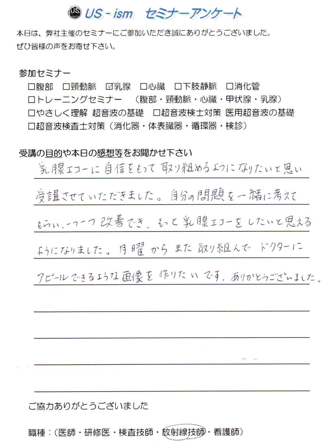 自分の問題を一緒に考えてもらい、一つ一つ改善でき、もっと乳腺エコーをしたいと思えるようになりました。月曜からまた取り組んで、ドクターにアピールできるような画像を作りたいです。