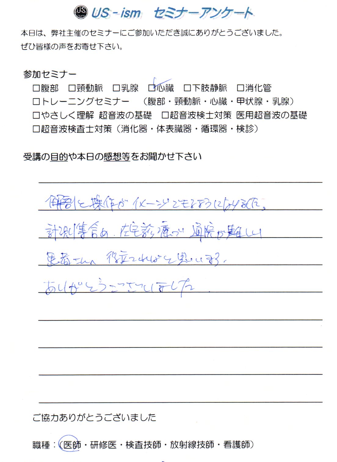 普段は医師のエコーを見ていたため、気をつけるポイントや細かい記録の方法など、はじめて知ることが多く、とても貴重な学びを得ることが出来ました。どうもありがとうございました。